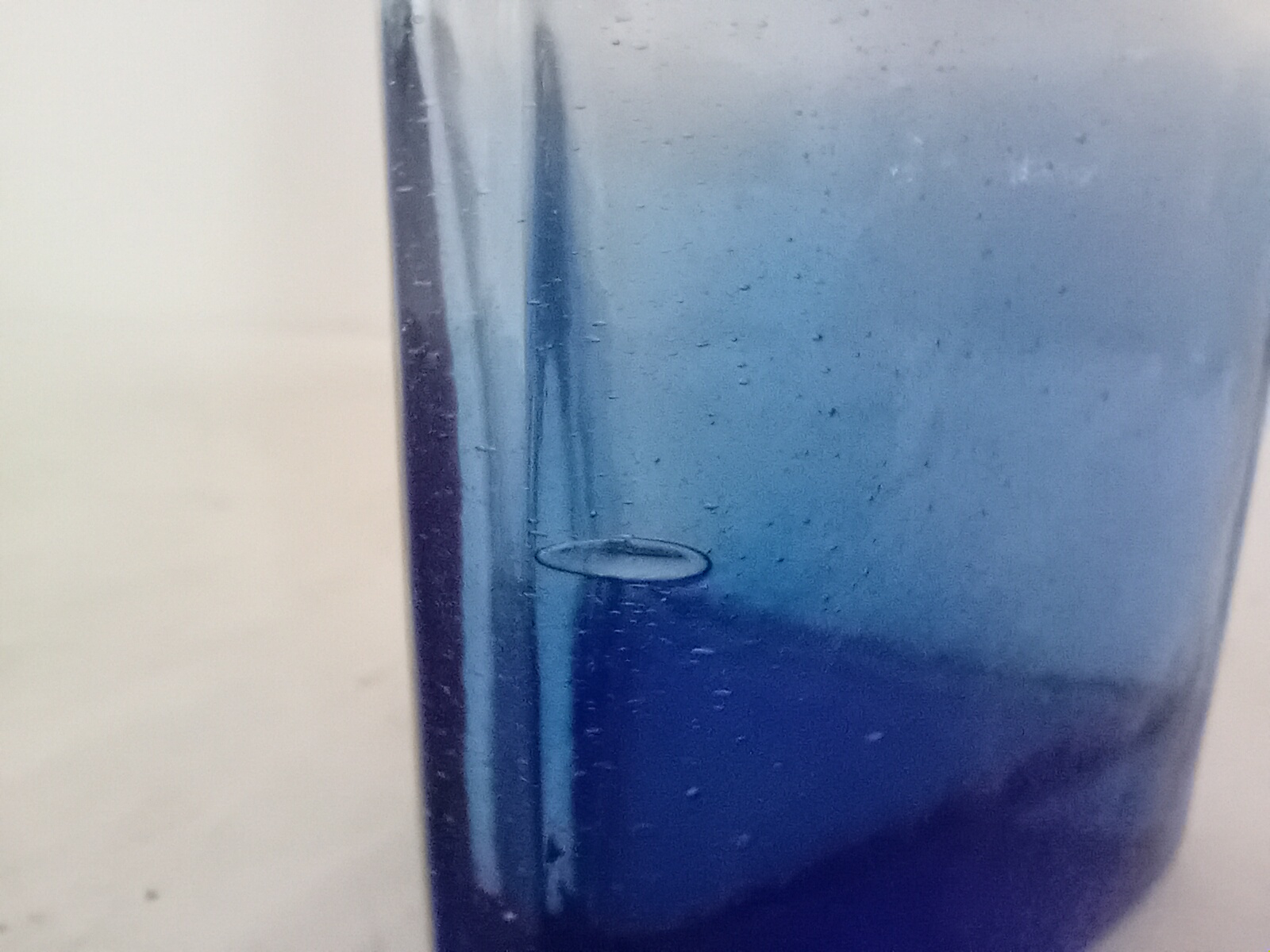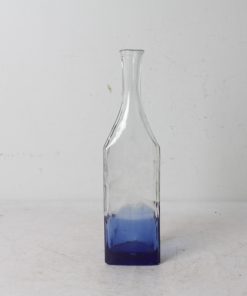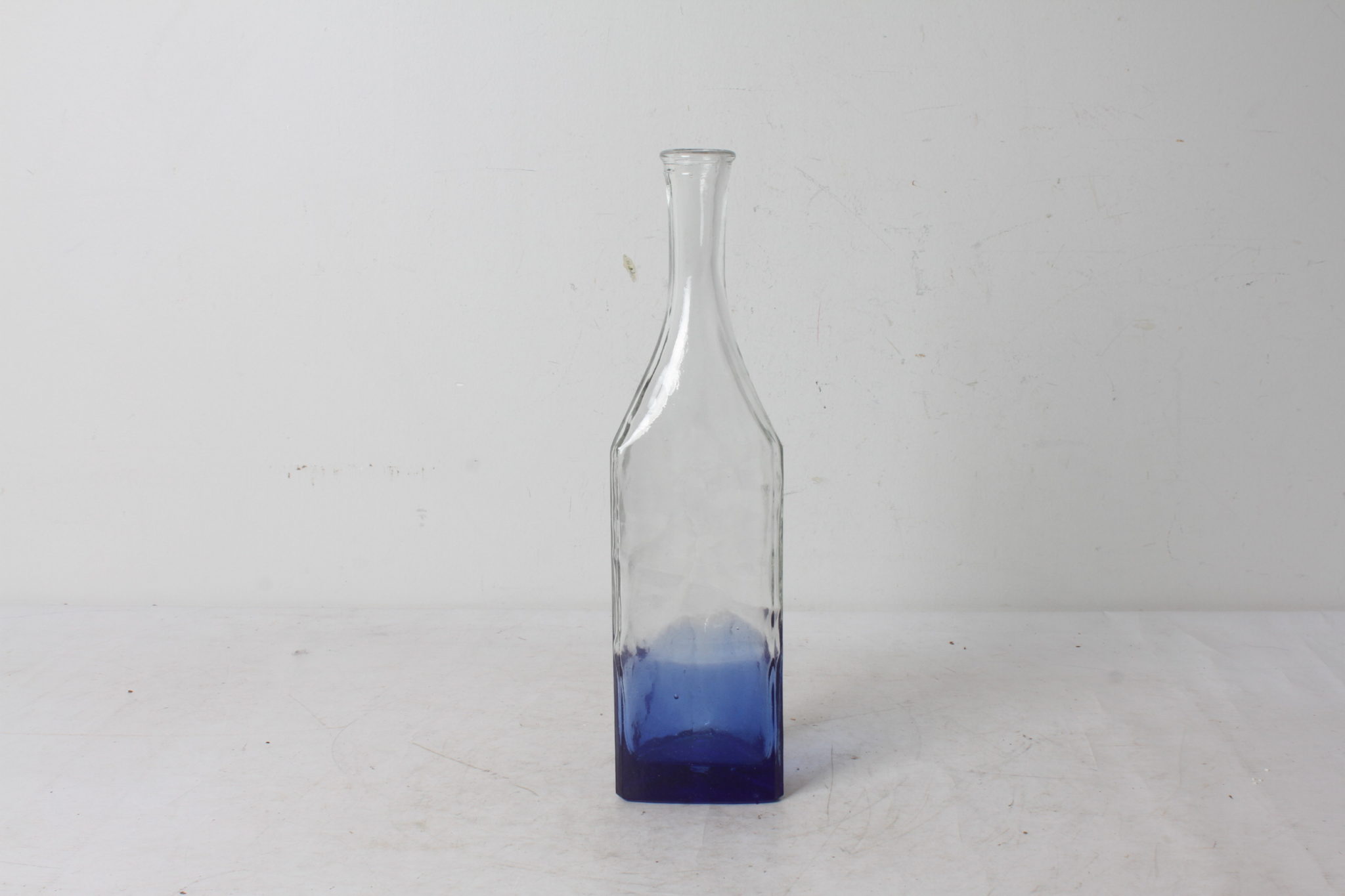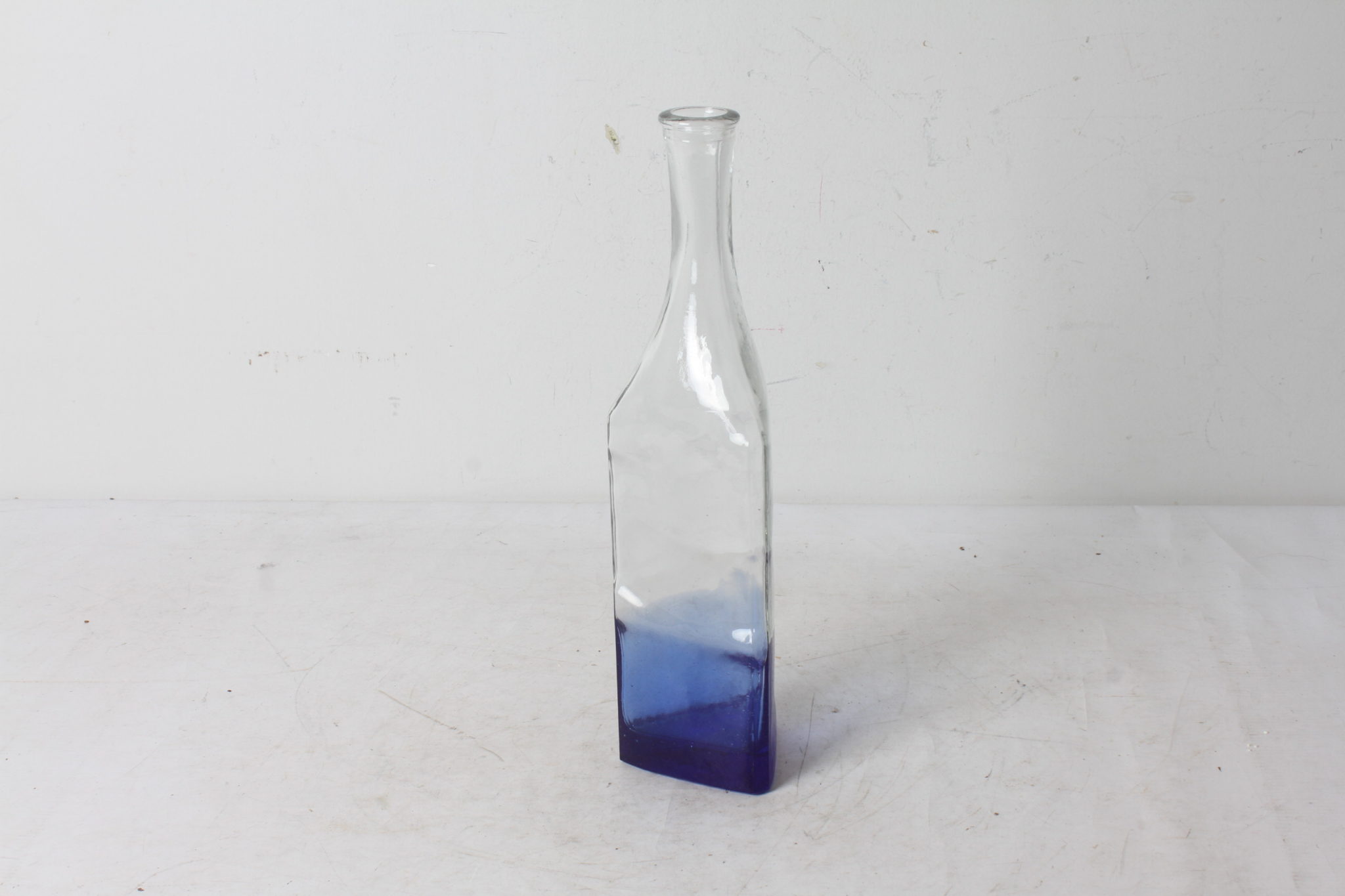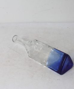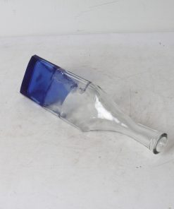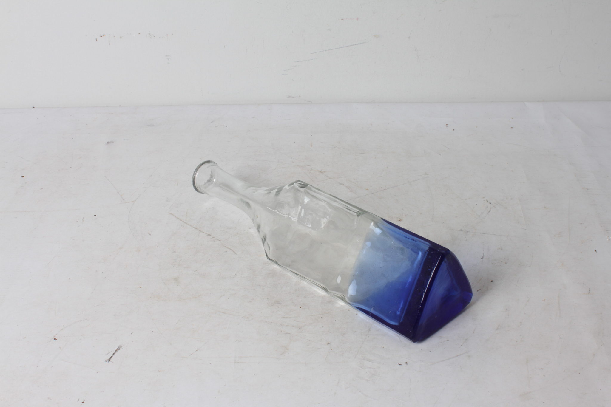 Bouteille en verre épais à reliefs, tiers inférieur bleu cobalt.