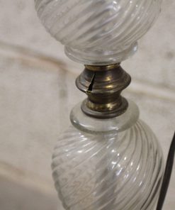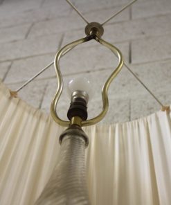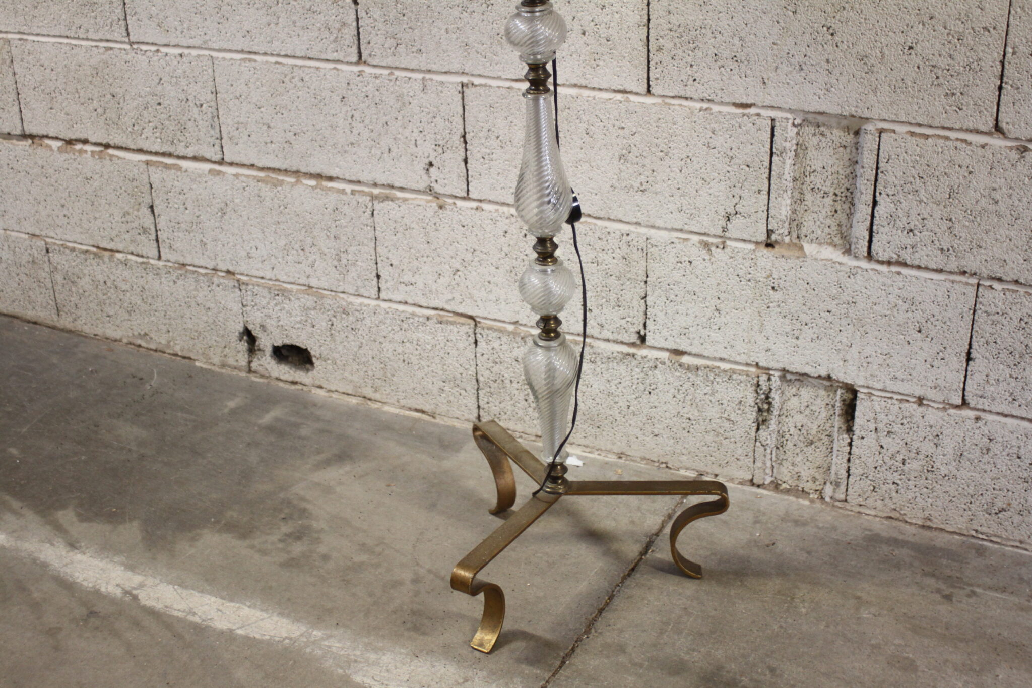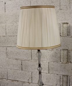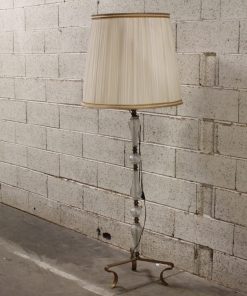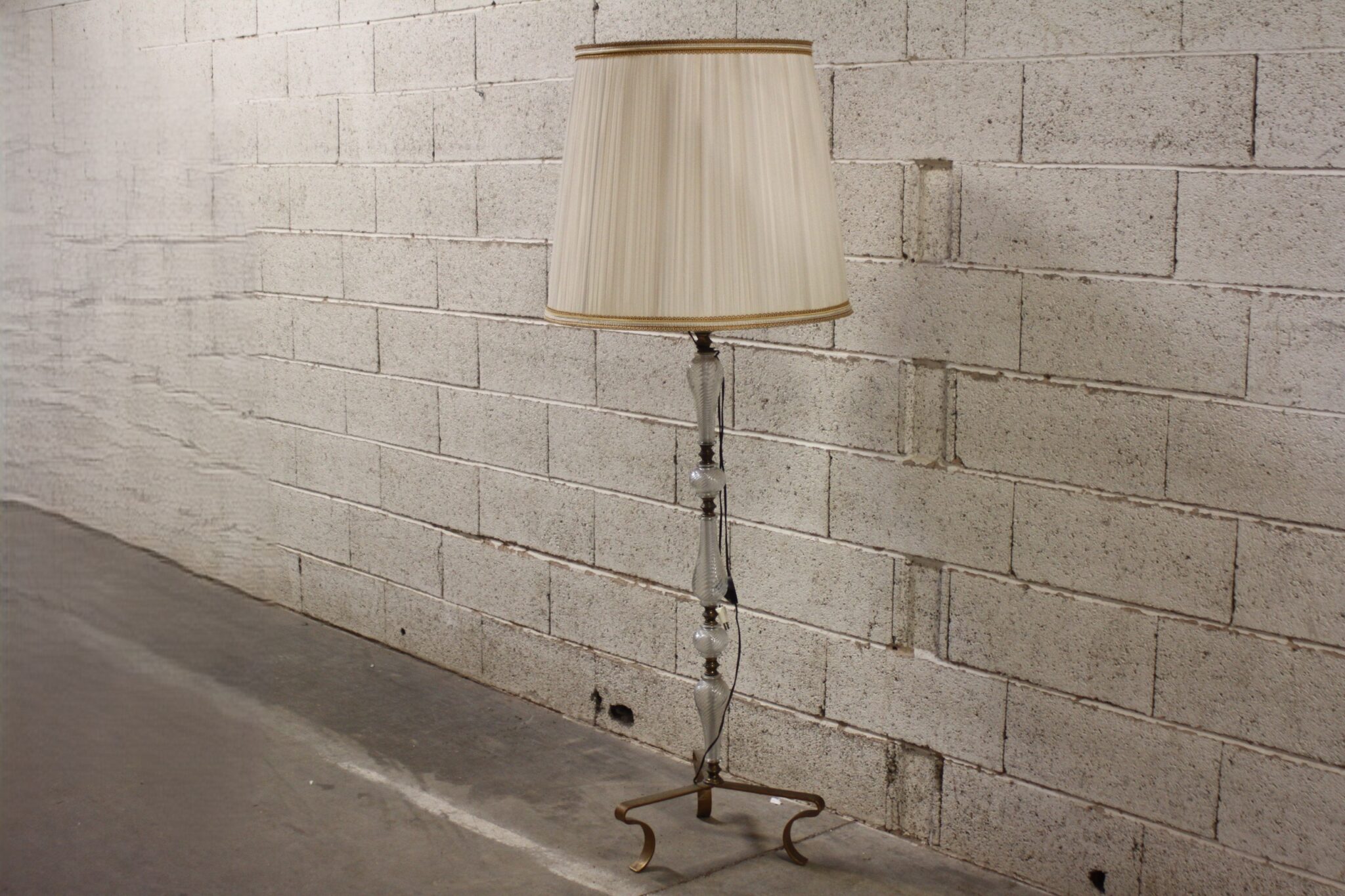 Lampadaire sur pied en laiton et verre avec abat-jour en tissu plissé.