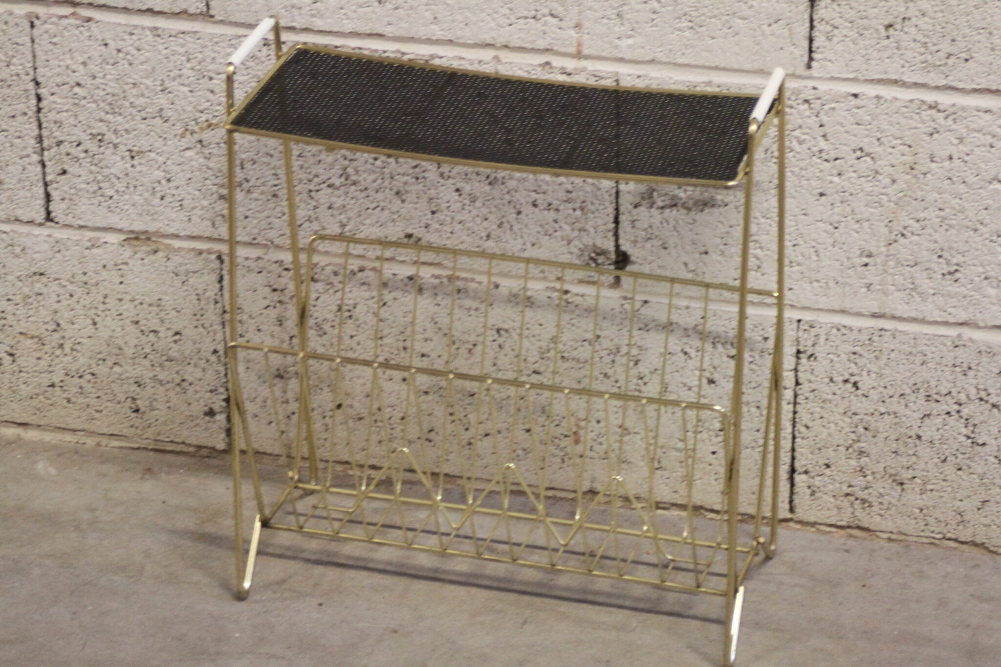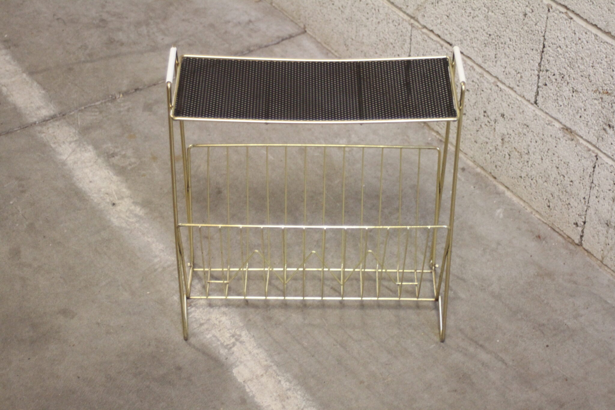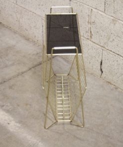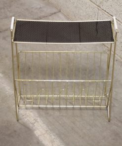 Porte-revues vintage en métal doré avec tablette ajourée noire.