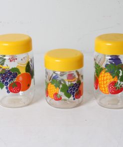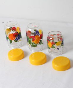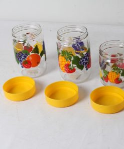 Bocaux en verre à décor fruits avec couvercle en plastique jaune.